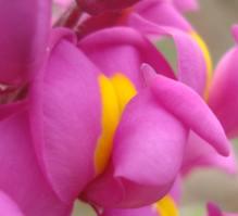Flowers are bright magenta pink with yellow nectar guides. They are densely clustered in a pyramid shape along the tips of branches with 30 or more individual flowers per stem. They have a beautiful sweet fragrance, reminiscent of icecream. Flowering occurs in mid- to late spring (October to December). After pollination long oblong seed pods form.
